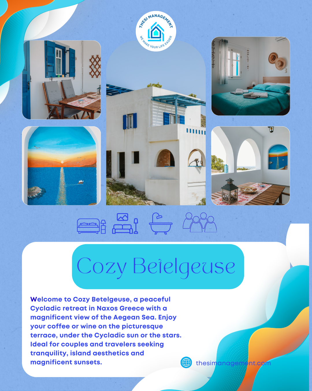 Welcome to Cozy Betelgeuse, a quiet Cycladic retreat with a magnificent view of the Aegean Sea. Enjoy your coffee or wine on the picturesque terrace, accompanied by the Cycladic sun or the stars. Ideal for couples and travelers looking for peace, island aesthetics and enchanting sunsets.