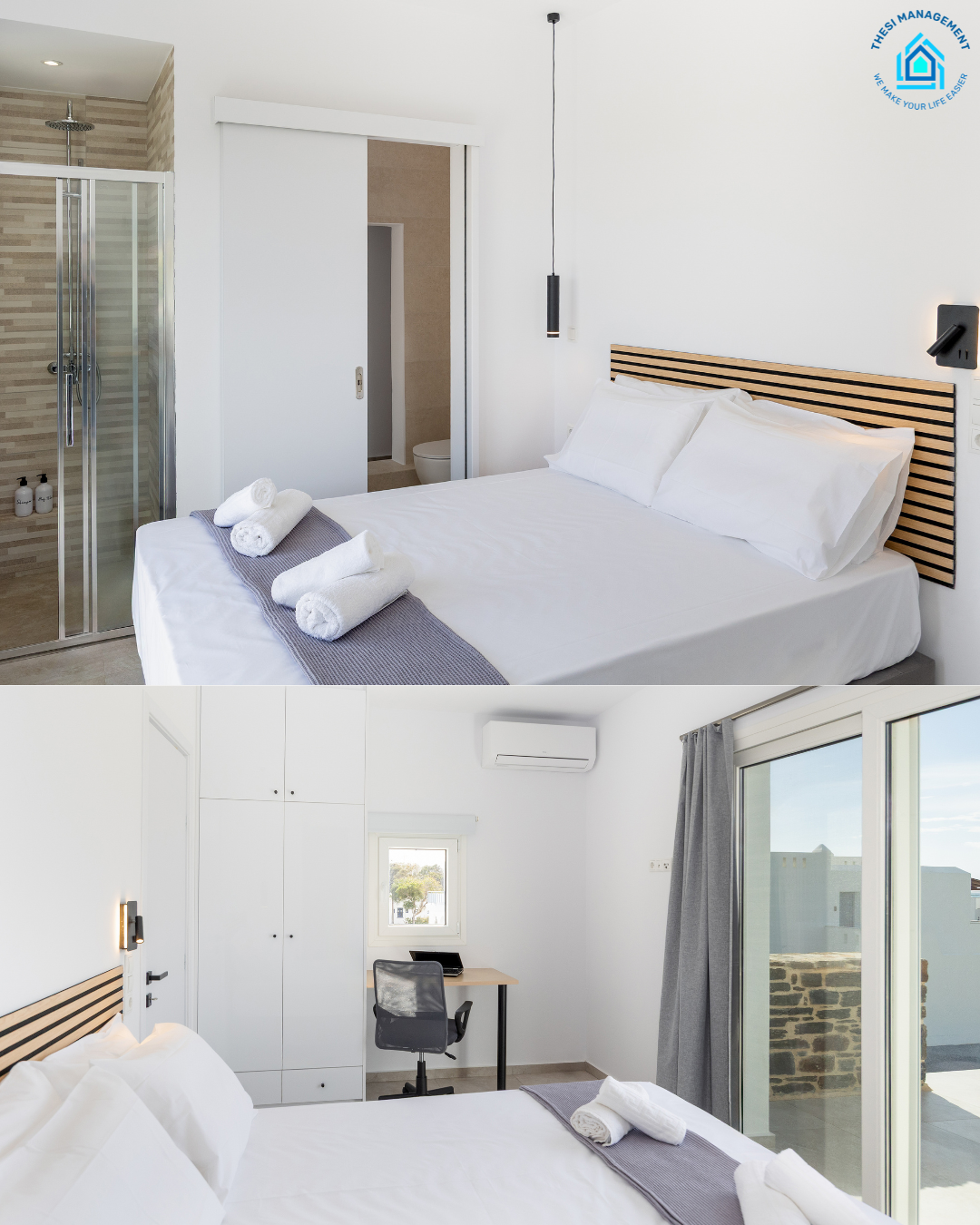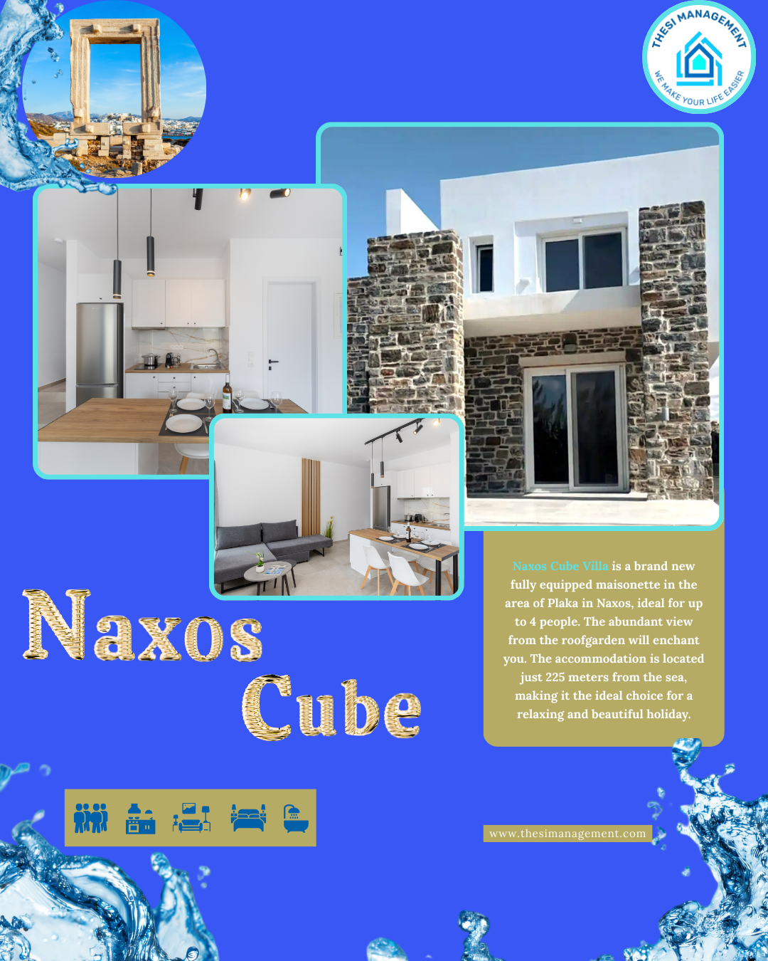 Naxos Cube Villa is a brand new fully equipped maisonette in the area of Plaka in Naxos, ideal for up to 4 people. It has one bedroom on the first floor with a wonderful sea view, two modern bathrooms (one per floor) and a large sofa bed on the ground floor, offering comfort and functionality. The abundant view from the roof garden will enchant you. The accommodation is located just 225 meters from the sea, making it the ideal choice for a relaxing and beautiful holiday.