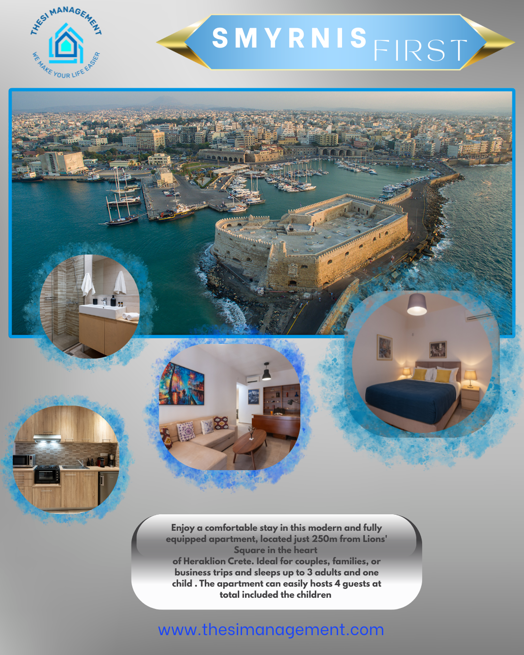 Enjoy a comfortable stay in this modern and fully equipped apartment, located just 250m from Lions' Square in the heart of Heraklion Crete. Ideal for couples, families, or business trips and sleeps up to 3 adults and one child . The apartment can easily hosts 4 guests at total included the children