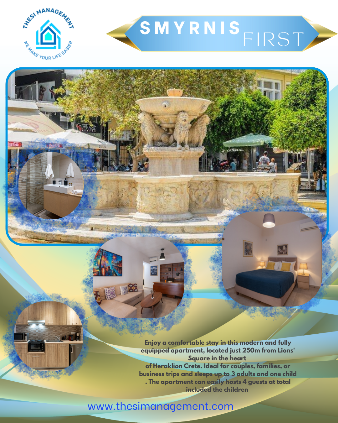 Enjoy a comfortable stay in this modern and fully equipped apartment, located just 250m from Lions' Square in the heart of Heraklion. Ideal for couples, families, or business trips and sleeps up to 3 adults and one child . The apartment can easily hosts 4 guests at total included the children