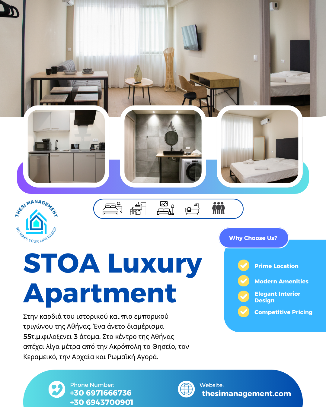 In the heart of the historic and most commercial triangle of Athens, a comfortable 55 sq.m. apartment awaits you, accommodating up to 3 people. Ideally located between Syntagma, Monastiraki and Omonia squares, it is just a few steps from the Acropolis, Thiseio, Kerameikos, as well as the Ancient and Roman Markets. The apartment is next to the metro and all transportation, while it is at the center of the commercial and gastronomic scene of the city.
